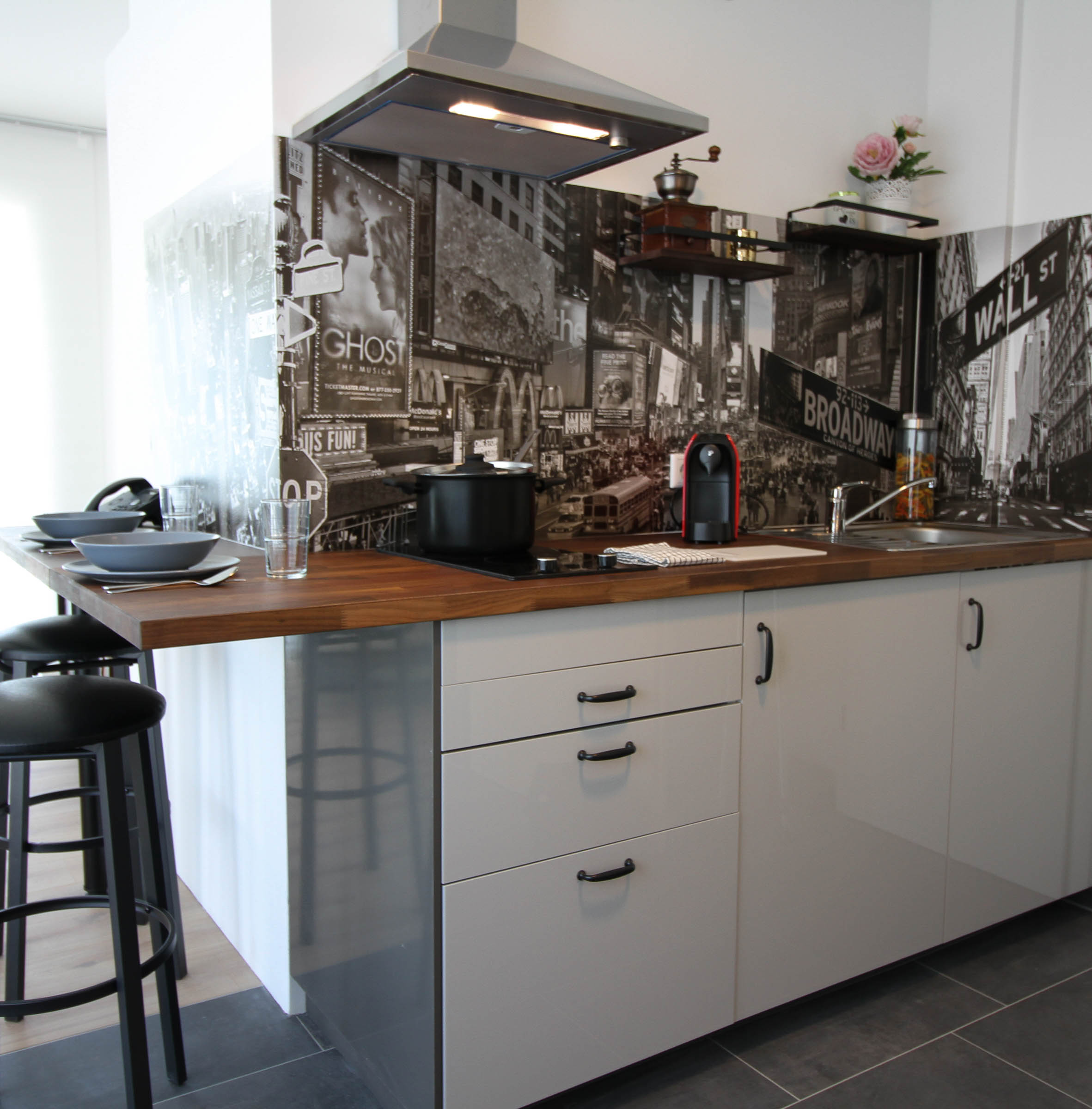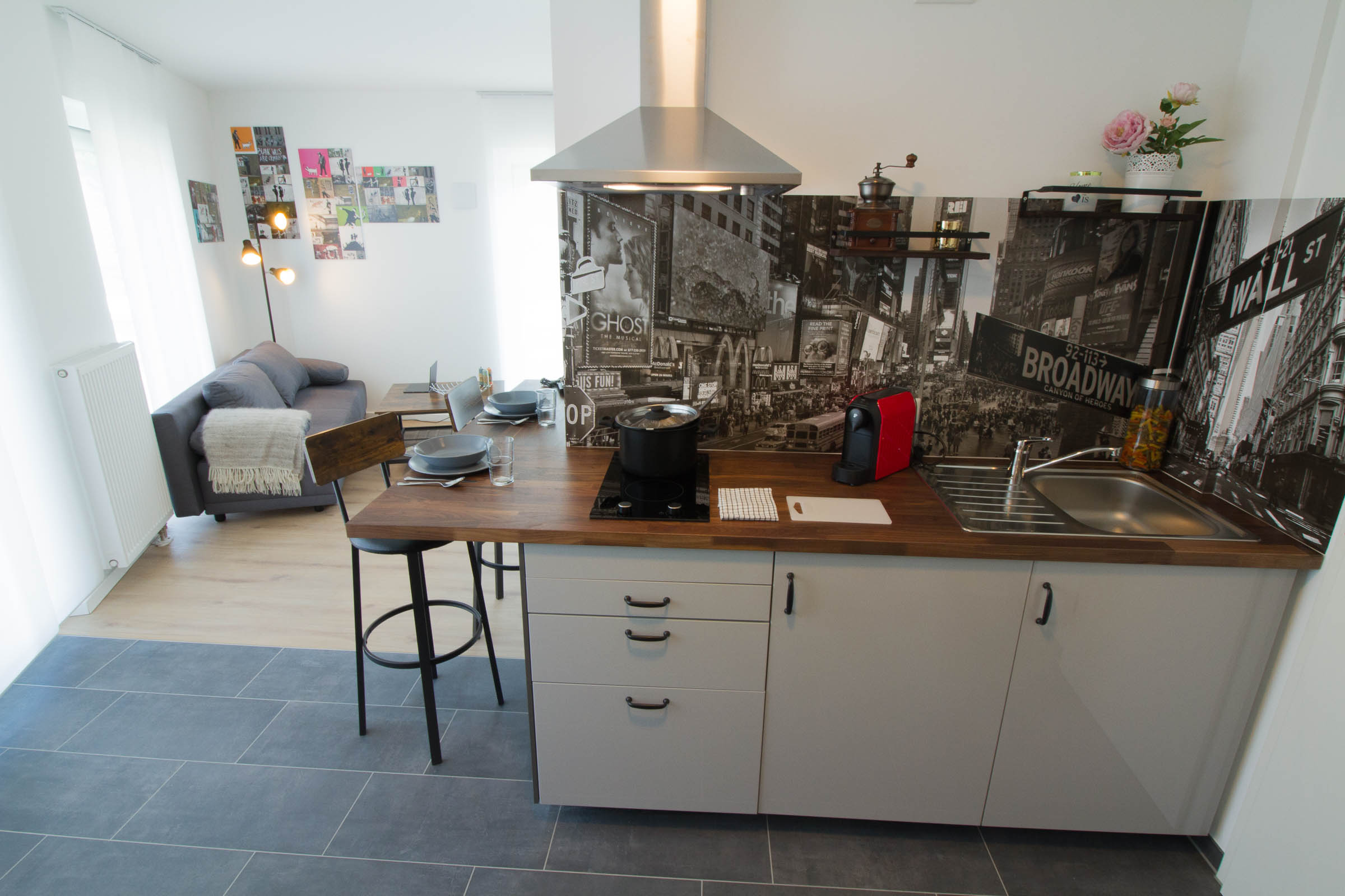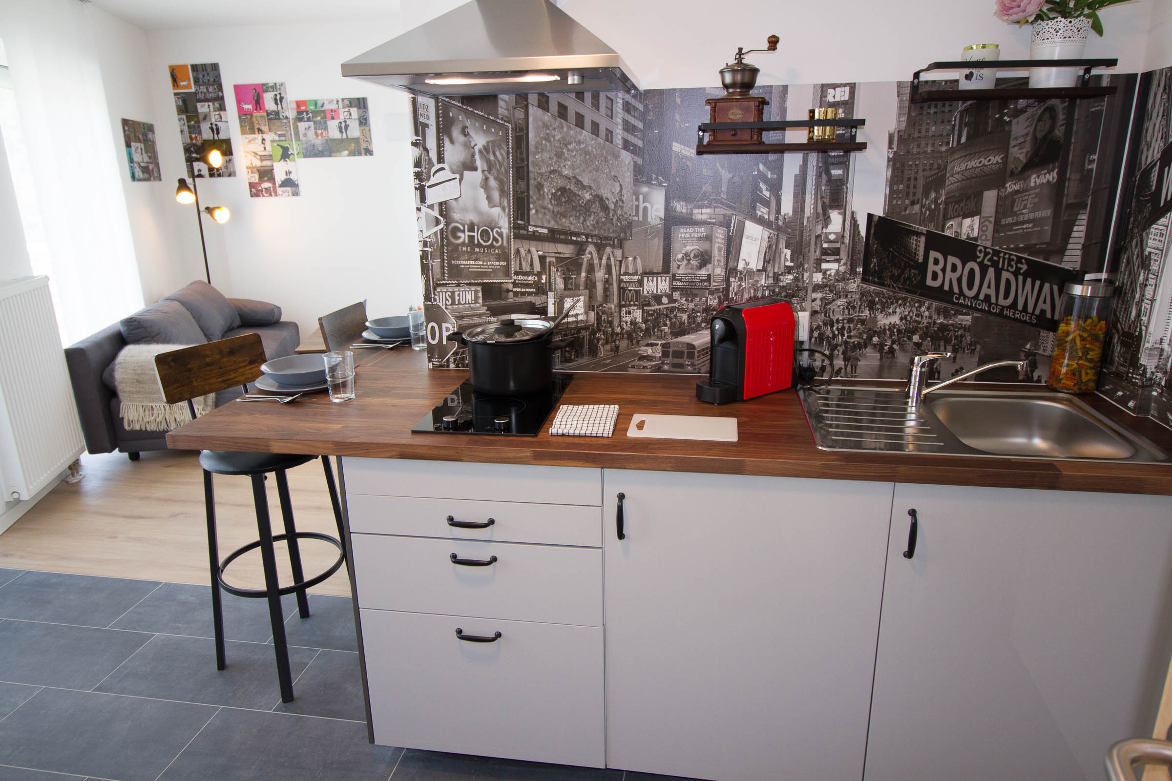 Die Küchenzeile verfügt über eine Esstheke mit zwei Barhockern, einer Mikrowelle inklusive Grill, einem geräumigen Einbaukühlschrank mit Eisfach, einem Herd mit Ceranfeld, einer Dunstabzugshaube sowie einer Edelstahlspüle. Geschirr, Gläser, Besteck sowie ein Topf- und Pfannenset stehen für Sie bereit.